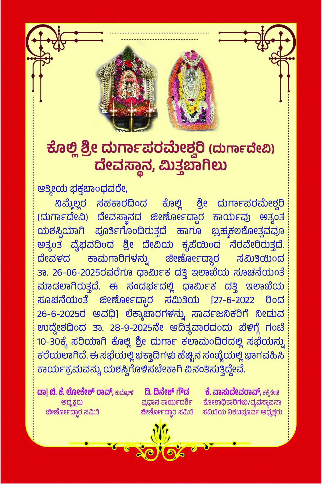 ಈ ಸಂದರ್ಭದಲ್ಲಿ ಧಾರ್ಮಿಕ ದತ್ತಿ ಇಲಾಖೆಯ ಸೂಚನೆಯಂತೆ ಜೀರ್ಣೋದ್ಧಾರ ಸಮಿತಿಯ [27-6-2022 ರಿಂದ 26-6-2025ರ ಅವಧಿ] ಲೆಕ್ಕಾಚಾರಗಳನ್ನು ಸಾರ್ವಜನಿಕರಿಗೆ ನೀಡುವ ಉದ್ದೇಶದಿಂದ ಸೆ.28 ರಂದು ಬೆಳಿಗ್ಗೆ ಗಂಟೆ 10-30ಕ್ಕೆ ಕೊಲ್ಲಿ ಶ್ರೀ ದುರ್ಗಾ ಕಲಾಮಂದಿರದಲ್ಲಿ ಸಭೆಯನ್ನು ಕರೆಯಲಾಗಿದೆ. ಈ ಸಭೆಯಲ್ಲಿ ಭಕ್ತಾದಿಗಳು ಹೆಚ್ಚಿನ ಸಂಖ್ಯೆಯಲ್ಲಿ ಭಾಗವಹಿಸಿ ಕಾರ್ಯಕ್ರಮವನ್ನು ಯಶಸ್ವಿಗೊಳಿಸಬೇಕು ಎಂದು ಜೀರ್ಣೋದ್ಧಾರ ಸಮಿತಿಯ ಪದಾಧಿಕಾರಿಗಳು ತಿಳಿಸಿದ್ದಾರೆ.