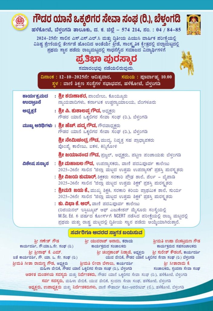 ಬೆಳ್ತಂಗಡಿ: ಹಳೆಕೋಟೆ ಗೌಡರ ಯಾನೆ ಒಕ್ಕಲಿಗರ ಸೇವಾ ಸಂಘದ ವತಿಯಿಂದ ಅಕ್ಟೋಬರ್ 12ರಂದು ವಾಣಿ ಶಿಕ್ಷಣ ಸಂಸ್ಥೆಗಳ ಸಭಾಂಗಣದಲ್ಲಿ 2024-25ನೇ ಸಾಲಿನ ಎಸ್.ಎಸ್.ಎಲ್.ಸಿ ಮತ್ತು ದ್ವಿತೀಯ ಪಿಯುಸಿ ವಾರ್ಷಿಕ ಪರೀಕ್ಷೆಯಲ್ಲಿ ವಿಶಿಷ್ಟ ಶ್ರೇಣಿಯಲ್ಲಿ ತೇರ್ಗಡೆ ಹೊಂದಿದ ಹಾಗೂ ಕ್ರೀಡೆ, ಸಾಂಸ್ಕ್ರತಿಕ ಕ್ಷೇತ್ರದಲ್ಲಿ ಜಿಲ್ಲಾಮಟ್ಟದಲ್ಲಿ, ರಾಜ್ಯಮಟ್ಟದಲ್ಲಿ ಸಾಧನೆಗೈದ ಸಮಾಜದ ವಿದ್ಯಾರ್ಥಿಗಳಿಗೆ ಪ್ರತಿಭಾ ಪುರಸ್ಕಾರ ಸಮಾರಂಭದ ಆಮಂತ್ರಣ ಪತ್ರ ಬಿಡುಗಡೆ ಕಾರ್ಯಕ್ರಮವು ಸೆ. 27ರಂದು ವಾಣಿ ಶಿಕ್ಷಣ ಸಂಸ್ಥೆಗಳ ಸಭಾಂಗಣದಲ್ಲಿ ಜರಗಿತು.
