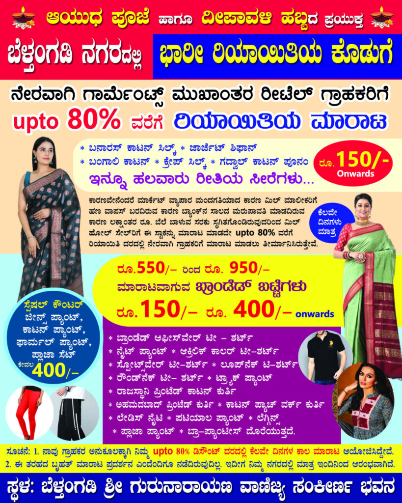 ಗ್ರಾಹಕರ ಅನುಕೂಲಕ್ಕಾಗಿ ನಿಮ್ಮ (UPTO) 80% ಡಿಸ್ಕೌಂಟ್ ದರದಲ್ಲಿ ಕೆಲವೇ ದಿನಗಳ ಕಾಲ ಮಾರಾಟ ಆಯೋಜಿಸಿದ್ದೇವೆ ಇತರದ ಬೃಹತ್ ಮಾರಾಟ ಪ್ರದರ್ಶನ ಎಂದೆಂದಿಗೂ ನಡೆದಿರುವುದಿಲ್ಲ ಇದೀಗ ನಿಮ್ಮ ನಗರದಲ್ಲಿ ಮಾತ್ರ ಇಂದಿನಿಂದ ಆರಂಭವಾಗಿದೆ ಗ್ರಾಹಕರು ಇದರ ಸದುಪಯೋಗವನ್ನು ಪಡೆದುಕೊಳ್ಳಬೇಕು. ಸೆ. 30ರಿಂದ ಬಿಗ್ ಡಿಸ್ಕೌಂಟ್ ಸೇಲ್ ವಿಶೇಷ ರಿಯಾಯಿತಿ ದರದಲ್ಲಿ ಉಡುಪು ಮಾರಾಟ ಮೇಳನಡೆಯಲಿದೆ ಎಂದು ಮಾಲಕರು ತಿಳಿಸಿದ್ದಾರೆ.