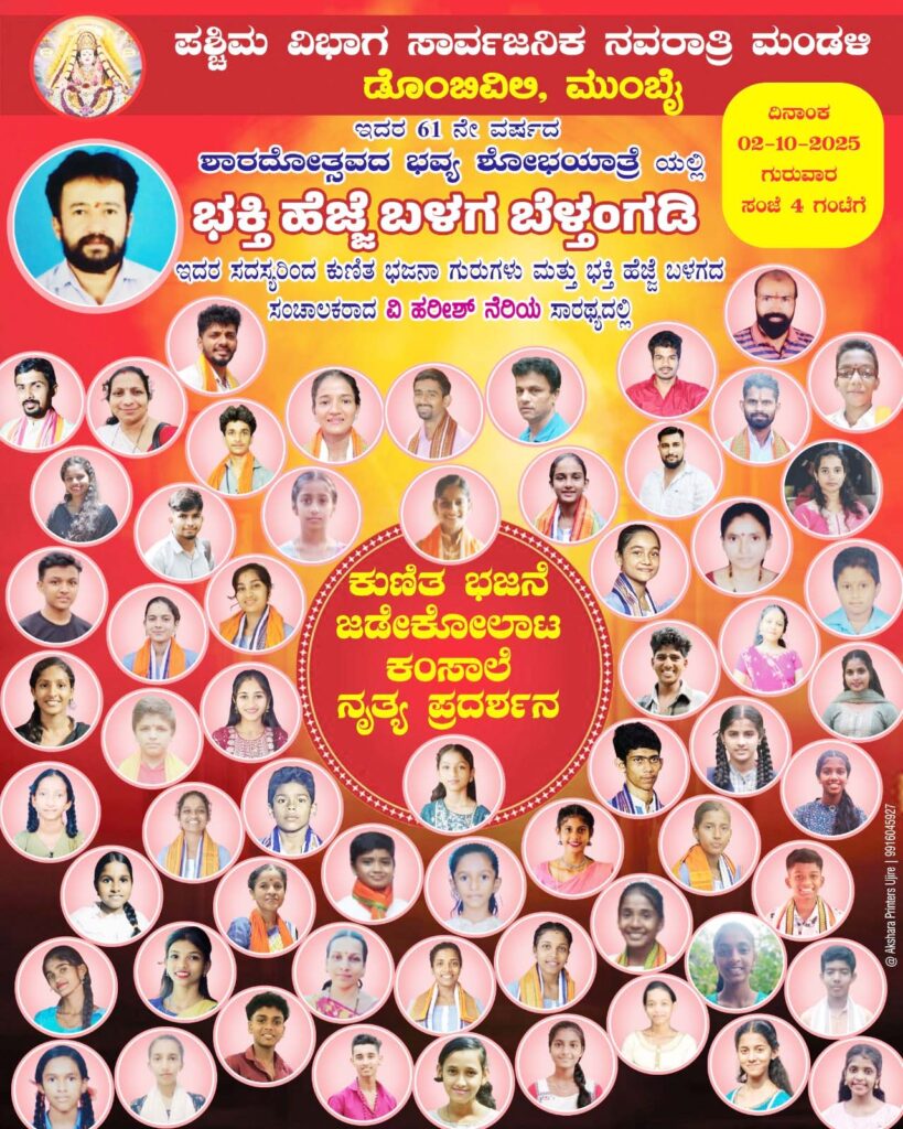 ಬೆಳ್ತಂಗಡಿ: ಪಶ್ಚಿಮ ವಿಭಾಗ ಮುಂಬೈ ಸಾರ್ವಜನಿಕ ನವರಾತ್ರಿ ಮಂಡಳಿ ಡೊಂಬಿವಿಲಿಯ 61ನೇ ವರ್ಷದ ಶಾರದೋತ್ಸವದ ಭವ್ಯ ಶೋಭಯಾತ್ರೆಯು ಅ. 2ರಂದು ನಡೆಯಲಿದ್ದು. ಈ ಶೋಭಯಾತ್ರೆಯಲ್ಲಿ ಕುಣಿತ ಭಜನೆ, ಜಡೇಕೋಲಾಟ, ಕಂಸಾಲೆ ನೃತ್ಯ ಪ್ರದರ್ಶನ ನೀಡಲು ಭಕ್ತಿ ಹೆಜ್ಜೆ ಬಳಗಕ್ಕೆ ಪ್ರಾಯೋಜಕತ್ವ ನೀಡಿ ಸಮಿತಿಯವರು ಆಹ್ವಾನ ನೀಡಿದ್ದು ಇದರಂತೆ ಕುಣಿತ ಭಜನಾ ಗುರುಗಳು ಮತ್ತು ಭಕ್ತಿ ಹೆಜ್ಜೆ ಬಳಗ ಬೆಳ್ತಂಗಡಿಯ ಸಂಚಾಲಕ ವಿ. ಹರೀಶ್ ನೆರಿಯ ಸಾರಥ್ಯದಲ್ಲಿ ಭಕ್ತಿ ಹೆಜ್ಜೆ ಬಳಗ ಬೆಳ್ತಂಗಡಿಯ 62 ಭಜಕ ಸದಸ್ಯರು ಮುಂಬೈಗೆ ತೇರಳ್ತಾ ಇದ್ದಾರೆ.
