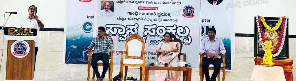 ಗುರುವಾಯನಕೆರೆ: ಶ್ರೀ ಕ್ಷೇತ್ರ ಧರ್ಮಸ್ಥಳ ಗ್ರಾಮಾಭಿವೃದ್ಧಿ ಯೋಜನೆ ಬಿ. ಸಿ ಟ್ರಸ್ಟ್, ಬೆಳ್ತಂಗಡಿ ಅಖಿಲ ಕರ್ನಾಟಕ ಜನ ಜಾಗೃತಿ ವೇದಿಕೆ ಮತ್ತು ಎಕ್ಸೆಲ್ ಪದವಿ ಪೂರ್ವ ಕಾಲೇಜಿನ ಆಶ್ರಯದಲ್ಲಿ ಗಾಂಧಿ ಜಯಂತಿ ಪ್ರಯುಕ್ತ ದುಶ್ಚಟಗಳ ವಿರುದ್ಧ ಜಾಗೃತಿ ಮೂಡಿಸುವ ಸ್ವಾಸ್ಥ್ಯ ಸಂಕಲ್ಪ ಕಾರ್ಯಕ್ರಮವನ್ನು ಎಕ್ಸೆಲ್ ಪದವಿ ಪೂರ್ವ ಕಾಲೇಜಿನಲ್ಲಿ ನಡೆಸಲಾಯಿತು.