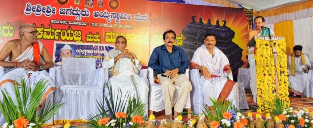 ಬೆಳ್ತಂಗಡಿ: ಶ್ರೀ ಜಗದ್ಗುರು ಅಯ್ಯ ಸ್ವಾಮಿ ಮಠ ಆಲoಗಾರು ಮೂಡಬಿದಿರೆ ಪುನರ್ ನಿರ್ಮಾಣ ಜೀರ್ಣೋದ್ಧಾರದ ಪ್ರಯುಕ್ತ ನಡೆದ ಶ್ರೀ ಗುರು ಮತ್ತು ವಿಶ್ವಕರ್ಮ ಯಜ್ಞದ ಶುಭಾವಸರದಲ್ಲಿ ಅಲಂಗಾರಿನ ಪಾಲ್ಕೆ ಬಾಬುರಾಯ ಆಚಾರ್ಯ ವೇದಿಕೆಯಲ್ಲಿ ಗೇರುಕಟ್ಟೆಯ ಅರ್ಕುಳ ಸುಬ್ರಾಯ ಆಚಾರ್ಯ ಪ್ರತಿಷ್ಠಾನದಿಂದ ಕರ್ನಾಟಕ ರಾಜ್ಯೋತ್ಸವ ಪ್ರಶಸ್ತಿ ಪುರಸ್ಕೃತ ಬಡಗುತಿಟ್ಟಿನ ಪ್ರಸಿದ್ಧ ಕಲಾವಿದ ತೀರ್ಥಹಳ್ಳಿ ಗೋಪಾಲ ಆಚಾರ್ಯ ಇವರಿಗೆ ಅರ್ಕುಳ ಪ್ರಶಸ್ತಿ ಪ್ರದಾನ ಮಾಡಲಾಯಿತು.