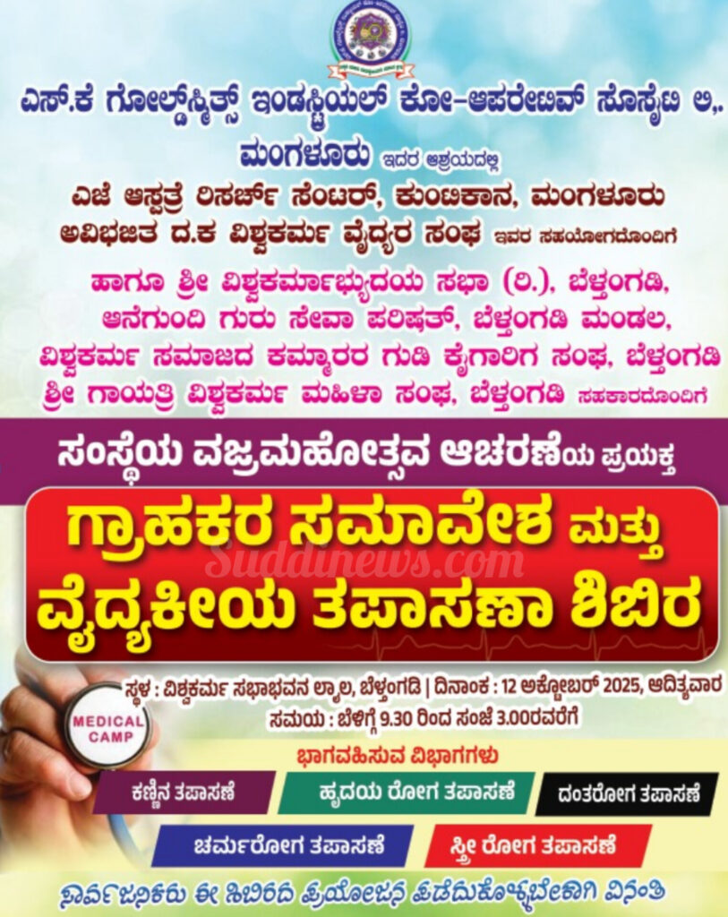 ಬೆಳ್ತಂಗಡಿ: ಮಂಗಳೂರು ಎಸ್.ಕೆ ಗೋಲ್ಡ್ ಸ್ಮಿತ್ ಇಂಡಸ್ಟ್ರಿಯಲ್ ಕೋ-ಆಪರೇಟಿವ್ ಸೊಸೈಟಿ ಆಶ್ರಯದಲ್ಲಿ ಮಂಗಳೂರು ಕುಂಟಿಕಾನ ಎ.ಜೆ. ಆಸ್ಪತ್ರೆ ರಿಸರ್ಚ್ ಸೆಂಟರ್, ಅವಿಭಜಿತ ದ.ಕ ವಿಶ್ವಕರ್ಮ ವೈದ್ಯರ ಸಂಘದ ಸಹಯೋಗದೊಂದಿಗೆ ಹಾಗೂ ಬೆಳ್ತಂಗಡಿ ಶ್ರೀ ವಿಶ್ವಕರ್ಮಾಭ್ಯುದಯ ಸಭಾ, ಆನೆಗುಂದಿ ಗುರು ಸೇವಾ ಪರಿಷತ್, ಬೆಳ್ತಂಗಡಿ ಮಂಡಲ, ಬೆಳ್ತಂಗಡಿ ವಿಶ್ವಕರ್ಮ ಸಮಾಜದ ಕಮ್ಮಾರರ ಗುಡಿ ಕೈಗಾರಿಗ ಸಂಘ, ಶ್ರೀ ಗಾಯತ್ರಿ ವಿಶ್ವಕರ್ಮ ಮಹಿಳಾ ಸಂಘ ಸಹಕಾರದೊಂದಿಗೆ ಸಂಸ್ಥೆಯ ವಜ್ರಮಹೋತ್ಸವ ಆಚರಣೆಯ ಪ್ರಯಕ್ತ”ಗ್ರಾಹಕರ ಸಮಾವೇಶ ಮತ್ತು ವೈದ್ಯಕೀಯ ತಪಾಸಣಾ ಶಿಬಿರ” ಅ.12ರಂದು ಲಾಯಿಲ ವಿಶ್ವಕರ್ಮ ಸಭಾಭವನದಲ್ಲಿ ಜರಗಲಿರುವುದು ಎಂದು ಸಂಘಟಕರು ತಿಳಿಸಿದ್ದಾರೆ.