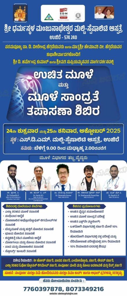 ಬೆಳ್ತಂಗಡಿ: ಉಜಿರೆಯ ಶ್ರೀ ಧರ್ಮಸ್ಥಳ ಮಂಜುನಾಥೇಶ್ವರ ಮಲ್ಟಿ-ಸ್ಪೆಷಾಲಿಟಿ ಆಸ್ಪತ್ರೆಯಲ್ಲಿ ಅ. 24 ಹಾಗೂ 25 ರಂದು ಬೆಳಿಗ್ಗೆ 9.00 ಗಂಟೆಯಿಂದ ಮಧ್ಯಾಹ್ನ 2.00 ಗಂಟೆವರೆಗೆ ಮೂಳೆ ವಿಭಾಗದ ತಜ್ಞ ವೈದ್ಯರಿಂದ ಉಚಿತ ಮೂಳೆ ಮತ್ತು ಮೂಳೆ ಸಾಂದ್ರತೆ ತಪಾಸಣಾ ಶಿಬಿರ ನೆಯಲಿದೆ.
