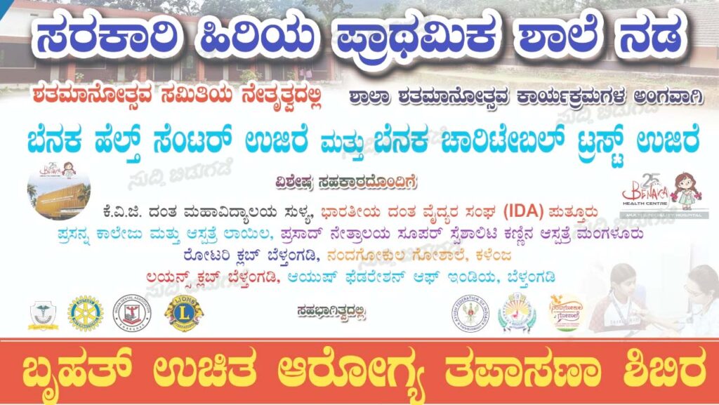 ನಡ: ಸರ್ಕಾರಿ ಹಿರಿಯ ಪ್ರಾಥಮಿಕ ಶಾಲೆಯ ಶತಮಾನೋತ್ಸವ ಸಮಿತಿಯ ನೇತೃತ್ವದಲ್ಲಿ ಉಜಿರೆ ಬೆನಕ ಹೆಲ್ತ್ ಸೆಂಟರ್ ಮತ್ತು ಚಾರಿಟೇಬಲ್ ಟ್ರಸ್ಟ್ ನಿಂದ ಬೃಹತ್ ಉಚಿತ ಆರೋಗ್ಯ ತಪಾಸಣಾ ಶಿಬಿರ ಅ. 12ರಂದು ನಡ ಶಾಲಾ ವಠಾರದಲ್ಲಿ ನಡೆಯಲಿದೆ.