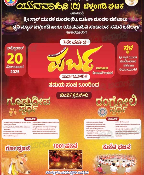 ಬೆಳ್ತಂಗಡಿ: ಯುವವಾಹಿನಿ ಘಟಕದ ಆಶ್ರಯದಲ್ಲಿ, ಶ್ರೀ ಸ್ಟಾರ್ ಯುವಕ ಮಂಡಲ, ಮಹಿಳಾ ಮಂಡಲ ಪಣೆಜಾಲು, ಬೆಳ್ತಂಗಡಿ ಧ್ವನಿ ನ್ಯೂಸ್ ಹಾಗೂ ಓಡಿಲ್ನಾಳ ಯುವವಾಹಿನಿ ಸಂಚಾಲನ ಸಮಿತಿ ಇವುಗಳ ಸಹಯೋಗದೊಂದಿಗೆ ದೀಪಾವಳಿ ಹಬ್ಬದ ಪ್ರಯುಕ್ತ 7ನೇ ವರ್ಷದ ತುಳುನಾಡ ತುಡರ ಪರ್ಬ ಸಾಮೂಹಿಕ ದೀಪಾವಳಿ ಆಚರಣೆ ಕಾರ್ಯಕ್ರಮ ಅ. 20ರಂದು ಸಂಜೆ ಆರಂಭಗೊಳ್ಳಲಿದೆ.
