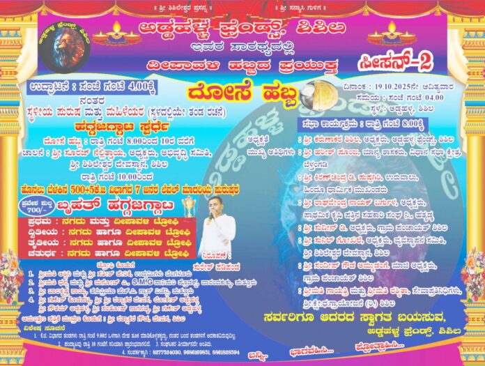 ಅ. 19: ಶಿಶಿಲ ಅಡ್ಡಹಳ್ಳ ಫ್ರೆಂಡ್ಸ್ ಸಾರಥ್ಯದಲ್ಲಿ ದೋಸೆ ಹಬ್ಬ-ಬೃಹತ್ ಹಗ್ಗಜಗ್ಗಾಟ