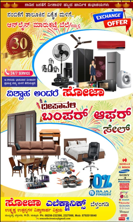 ಬೆಳ್ತಂಗಡಿ: ಸೋಜಾ ಇಲೆಕ್ಟ್ರಾನಿಕ್ಸ್ ನಲ್ಲಿ ದೀಪಾವಳಿ ಧಮಾಕ ಆಫರ್