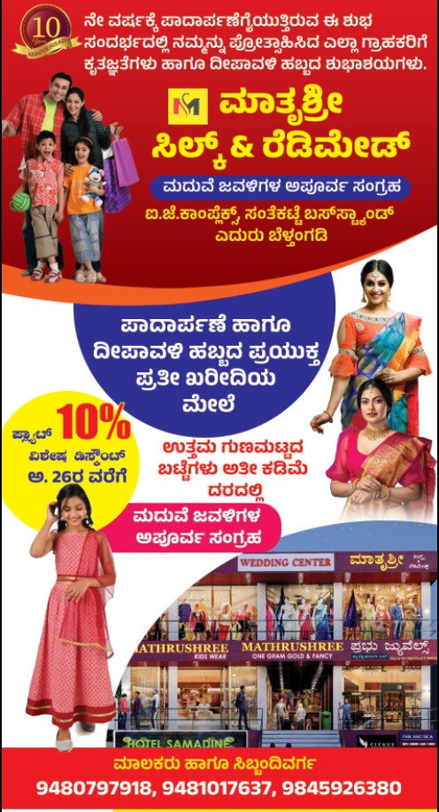ಬೆಳ್ತಂಗಡಿ: ಗುಣಮಟ್ಟದ ವಸ್ತ್ರಗಳನ್ನು ಗ್ರಾಹಕರಿಗೆ ನೀಡುವ ಮೂಲಕ ಪ್ರೀತಿ ವಿಶ್ವಾಸ, ನಂಬಿಕೆ, ಗಳಿಸಿ ವಸ್ತ್ರ ಉದ್ಯಮದಲ್ಲಿ ತನ್ನದೇ ಆದ ಚಾಪು ಮೂಡಿಸಿದ ಮಾತೃಶ್ರೀ ಟೆಕ್ಸ್ಟೈಲ್ಸ್ ಮತ್ತು ರೆಡಿಮೇಡ್ಸ್ ಸಂಸ್ಥೆಯು 10ನೇ ವರ್ಷಕ್ಕೆ ಪಾದಾರ್ಪಣೆ ಮಾಡುತ್ತಿರುವ ಈ ಶುಭ ಸಂದರ್ಭದಲ್ಲಿ ಹಾಗೂ ದೀಪಾವಳಿ ಹಬ್ಬದ ಪ್ರಯುಕ್ತ ಗ್ರಾಹಕರಿಗೆ ಮೆಗಾ ಡಿಸ್ಕೌಂಟ್ ಸೇಲ್ ಆರಂಭಿಸಿದೆ.ಪ್ರತಿ ವರ್ಷ ದೀಪಾವಳಿ ಸಂದರ್ಭದಲ್ಲಿ ಡಿಸ್ಕೌಂಟ್ ಸೇಲ್’ ಆರಂಭವಾಗುತ್ತಿದ್ದು ಈ ಬಾರಿ ಗ್ರಾಹಕರಿಗೆ ಉತ್ತಮ ಗುಣಮಟ್ಟದ ಬಟ್ಟೆಗಳೊಂದಿಗೆ ಖರೀದಿಯ ಮೇಲೆ ಫ್ಲ್ಯಾಟ್ 10% ಡಿಸ್ಕೌಂಟ್ ಸಿಗಲಿದೆ.