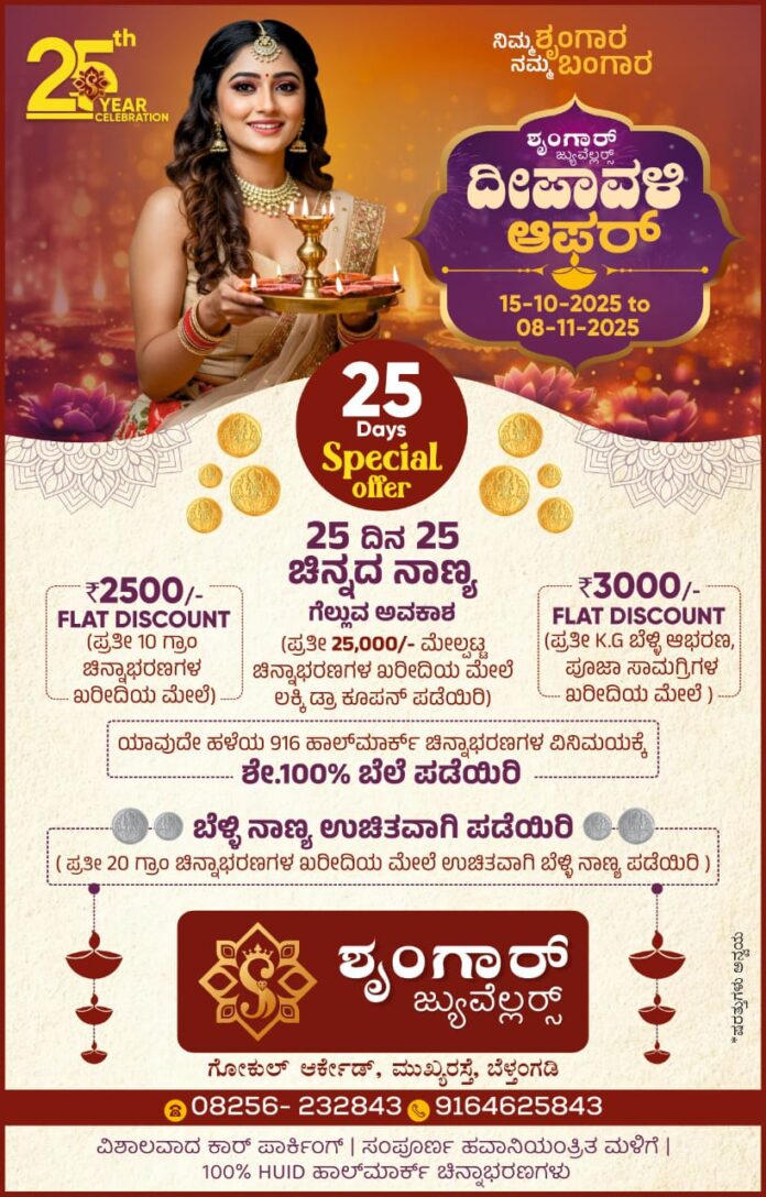 ಬೆಳ್ತಂಗಡಿ: ಶೃಂಗಾರ್ ಜುವೆಲ್ಲರ್ಗೆ 25ರಸಂಭ್ರಮ. 25ದಿನ25ಚಿನ್ನದ ನಾಣ್ಯ ಗೆಲ್ಲುವ ಸುವರ್ಣವಕಾಶ. 25ರ ಸಂಭ್ರಮದಲ್ಲಿದ್ದು ದೀಪಾವಳಿ ಹಬ್ಬದ ಪ್ರಯುಕ್ತ ಚಿನ್ನಾಭರಣಗಳ ಮೇಲೆಅ.15ರಿಂದ ನ.8ರವರೆಗೆ ಆಕರ್ಷಕ ಆಫರ್ ಲಭ್ಯ.ಪ್ರತಿ 10 ಗ್ರಾಂ ಚಿನ್ನಾಭರಣಗಳ ಮೇಲೆ ರೂ.2,500 ಫ್ಲಾಟ್ ಡಿಸ್ಕೌಂಟ್, 25 ದಿನ 25 ಚಿನ್ನದ ನಾಣ್ಯ ಗೆಲ್ಲುವ ಅವಕಾಶ ರೂ.25 ಸಾವಿರ ಮೇಲ್ಪಟ್ಟ ಚಿನ್ನಾಭರಣ ಖರೀದಿಯ ಮೇಲೆ ಲಕ್ಕಿ ಡ್ರಾ ಕೂಪಾನ್ ಪಡೆಯಲು ಅವಕಾಶವಿದೆ.
