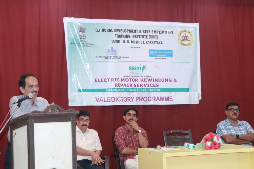 ಉಜಿರೆ ರುಡ್ ಸೆಟ್ ಸಂಸ್ಥೆಯಲ್ಲಿ 30 ದಿನಗಳ ಕಾಲ ನಡೆದ ಇಲೆಕ್ಟ್ರಿಕಲ್ ಮೋಟಾರು ರಿವೈಂಡಿಂಗ್ ಮತ್ತು ಪಂಪ್ ಸೆಟ್ ರಿಪೇರಿ ತರಬೇತಿಯ ಸಮಾರೋಪ ಸಮಾರಂಭದಲ್ಲಿ ಮುಖ್ಯ ಅತಿಥಿಯಾಗಿ ಭಾಗವಹಿಸಿ, ಪ್ರಮಾಣ ಪತ್ರ ವಿತ್ತರಿಸಿ ಮಾತನಾಡಿದರು. ಮೌಲ್ಯ ಮತ್ತು ಕೌಶಲ್ಯವನ್ನು ಸದ್ಬಳಕೆ ಮಾಡಿಕೊಳ್ಳಿ ಎಂದು ಶುಭ ಹಾರೈಸಿದರು.
