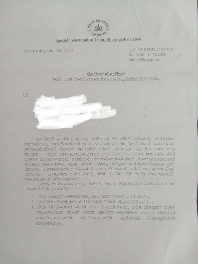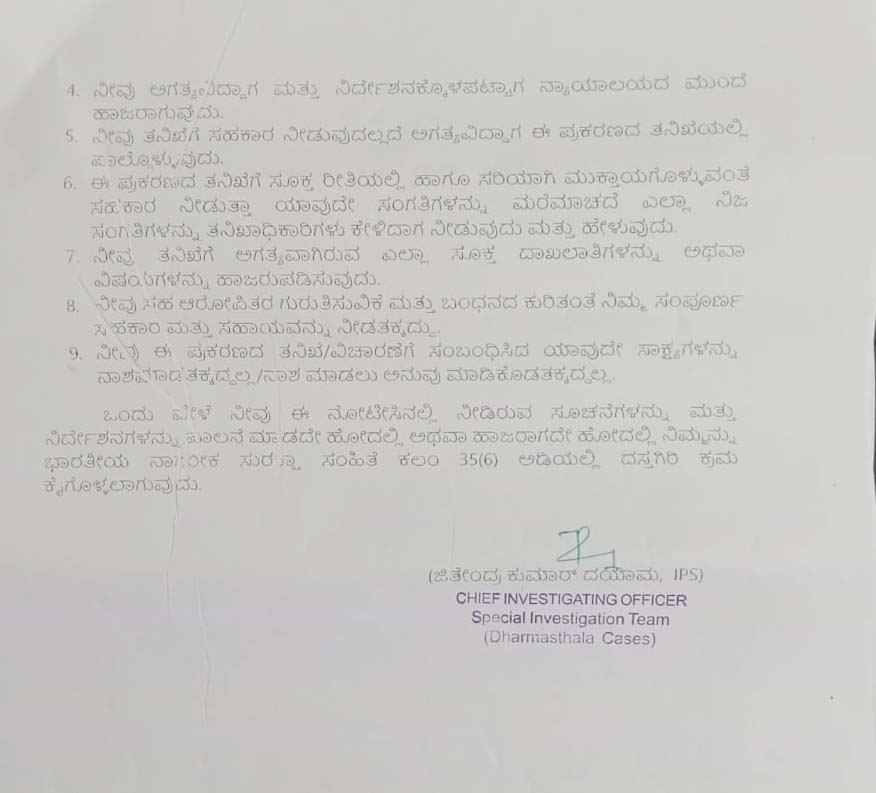 ಎಸ್ಐಟಿ ತನಿಖಾಧಿಕಾರಿ‌ ಜಿತೇಂದ್ರ ದಯಾಮಾ ನೀಡಿರುವ ನೋಟೀಸ್ ನಲ್ಲಿ ವಿಚಾರಣೆಗೆ ಹಾಜರಾಗದೇ ಇದ್ದರೆ ಬಂಧನ ಮಾಡುವ ಎಚ್ಚರಿಕೆ ನೀಡಿ ನೊಟೀಸ್ ನೀಡಲಾಗಿದೆ. ಬಿಎನ್ ಎಸ್ಎಸ್ 35(3) ಅಡಿಯಲ್ಲಿ ಪ್ರದತ್ತವಾದ ಅಧಿಕಾರ ಬಳಸಿಕೊಂಡು ನೀಡಿದ ನೊಟೀಸ್ ನಲ್ಲಿ ಹಲವು ಅಂಶವನ್ನು ತನಿಖಾಧಿಕಾರಿ‌ ದಯಾಮ ಉಲ್ಲೇಖಿಸಿದ್ದಾರೆ.