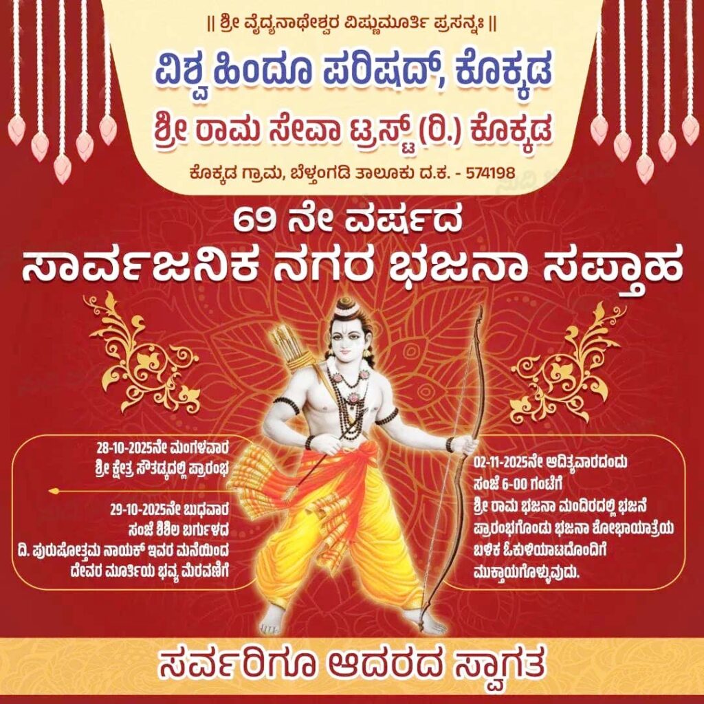 ಕೊಕ್ಕಡ: ವಿಶ್ವ ಹಿಂದೂ ಪರಿಷದ್ ಕೊಕ್ಕಡ ಘಟಕ ಹಾಗೂ ಶ್ರೀರಾಮ ಸೇವಾ ಟ್ರಸ್ಟ್ ಕೊಕ್ಕಡ ಇವರ ಸಹಯೋಗದಲ್ಲಿ 69ನೇ ವರುಷದ ಸಾರ್ವಜನಿಕ ನಗರ ಭಜನಾ ಸಪ್ತಾಹ ಅ.28ರಿಂದ ನ.03ರವರೆಗೆ ಭಕ್ತಿಭಾವದಿಂದ ನಡೆಯಲಿದೆ.