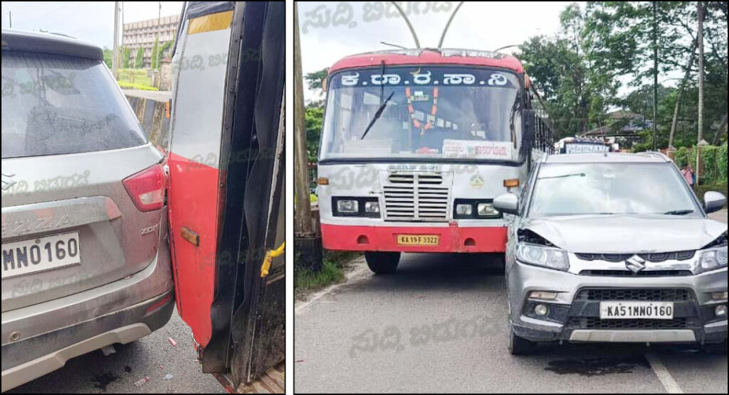 ವಾಹನವನ್ನು ನಿಯಂತ್ರಿಸಲು ಕಾರು ಚಾಲಕ ಬ್ರೇಕ್ ಹಾಕಿದ ಸಂದರ್ಭದಲ್ಲಿ ಹಿಂದೆಯಿಂದ ಬರುತ್ತಿದ್ದ ಬಸ್ಸನ್ನು ಚಾಲಕನಿಗೆ ನಿಯಂತ್ರಿಸಲಾಗದೆ ಕಾರಿನ ಹಿಂಭಾಗಕ್ಕೆ ಡಿಕ್ಕಿ ಹೊಡೆದಿದೆ.