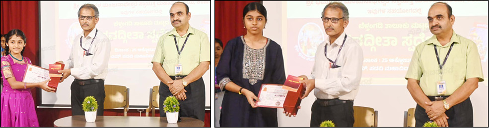 ಧರ್ಮಸ್ಥಳ: ಶ್ರೀ ಸೋಂದಾ ಸ್ವರ್ಣವಲ್ಲೀ ಮಹಾಸಂಸ್ಥಾನ, ಶ್ರೀ ಸರ್ವಜ್ಞೇಂದ್ರ ಸರಸ್ವತಿ ಪ್ರತಿಷ್ಠಾನ ಮತ್ತು ಉಜಿರೆ ಎಸ್.ಡಿ.ಎಂ. ಕಾಲೇಜಿನ ಸಂಸ್ಕೃತ ವಿಭಾಗದ ಜಂಟಿ ಸಹಯೋಗದಲ್ಲಿ ರಾಜ್ಯಮಟ್ಟದ ಶ್ರೀ ಭಗವದ್ಗೀತಾ ಅಭಿಯಾನ 2025ರ ಅಂಗವಾಗಿ ಎಸ್.ಡಿ.ಎಂ. ಕಾಲೇಜಿನಲ್ಲಿ ಅ.25ರಂದು ನಡೆದ ಬೆಳ್ತಂಗಡಿ ತಾಲೂಕು ಮಟ್ಟದ ಭಗವದ್ಗೀತಾ ಭಾಷಣ ಸ್ಪರ್ಧೆಯಲ್ಲಿ ಧರ್ಮಸ್ಥಳ ಎಸ್.ಡಿ.ಎಂ. ಆಂಗ್ಲ ಮಾಧ್ಯಮ ಶಾಲೆಯ 7ನೇ ತರಗತಿಯ ಆರಾಧ್ಯಾ ಪಿ. ಜೋಷಿ ಪ್ರಾಥಮಿಕ ವಿಭಾಗದಲ್ಲಿ, ಹಾಗೂ 10ನೇ ತರಗತಿಯ ಪೂರ್ವಿ ಭಟ್ ಪ್ರೌಢಶಾಲಾ ವಿಭಾಗದಲ್ಲಿ ಪ್ರಥಮ ಸ್ಥಾನವನ್ನು ಗಳಿಸಿ ಜಿಲ್ಲಾ ಮಟ್ಟಕ್ಕೆ ಆಯ್ಕೆಯಾಗಿರುತ್ತಾರೆ.