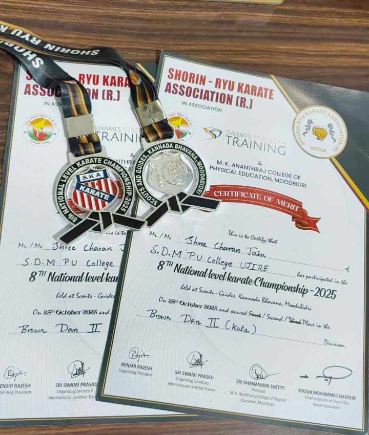 ಉಜಿರೆ: ಮೂಡಬಿದ್ರೆಯ ಎಂ.ಕೆ. ಆನಂತ್ರಾಜ್ ದೈಹಿಕ ಶಿಕ್ಷಣ ಮಹಾವಿದ್ಯಾಲಯ ಮತ್ತು ಶೋರಿನ್ ರಿಯು ಕರಾಟೆ ಆಸೋಸಿಯೇಶನ್ ಆಶ್ರಯದಲ್ಲಿ ಸ್ವಾಮೀಸ್ ಸ್ಟ್ರೇಂಥ್ ಟ್ರೈನಿಂಗ್ ಸಹಯೋಗದೊಂದಿಗೆ ಅ.25ರಂದು ಮೂಡಬಿದ್ರೆ ಸ್ಕೌಟ್ -ಗೈಡ್ಸ್ ಕನ್ನಡ ಭವನದಲ್ಲಿ ನಡೆದ 8ನೇ ರಾಷ್ಟ್ರೀಯ ಮಟ್ಟದ ಕರಾಟೆ ಚಾಂಪಿಯನ್ ಶಿಫ್ 2025ರಲ್ಲಿ ಕಟಾ ಮತ್ತು ಪೈಟಿಂಗ್ ವಿಭಾಗದಲ್ಲಿ ಉಜಿರೆ SDM ಕಾಲೇಜಿನ ಪ್ರಥಮ ಪಿ.ಯು. ವಿದ್ಯಾರ್ಥಿ ಬಂಗಾಡಿಯ ಶ್ರೀಚರಣ್ ಜೈನ್ ದ್ವಿತೀಯ ಸ್ಥಾನ ಪಡೆದು ಎರಡು ಬೆಳ್ಳಿ ಪದಕ ಗಳಿಸಿದ್ದಾರೆ.