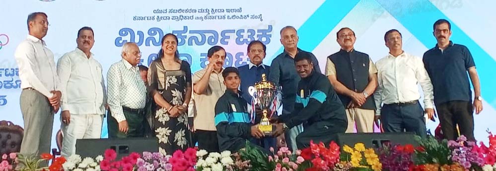 ಬೆಳ್ತಂಗಡಿ: ಮಿನಿ ರಾಜ್ಯ ಒಲಿಂಪಿಕ್ ನಲ್ಲಿ ಹದಿನಾಲ್ಕು ವರ್ಷದ ಒಳಗಿನ ಬಾಲಕರ ವಾಲಿಬಾಲ್ ಪಂದ್ಯಾಕೂಟದಲ್ಲಿ ಚಿನ್ನದ ಪದಕ ಹಾಗೂ ಟ್ರೋಫಿಯನ್ನು ಪಡೆದ ದಕ್ಷಿಣ ಕನ್ನಡ ಜಿಲ್ಲಾ ತಂಡದ ನಾಯಕ ಶಿಶಿರ್ ಜಯವಿಕ್ರಮ್ ಹಾಗೂ ಕೋಚ್ ಮನೋಜ್ ನೆಲ್ಯಾಡಿ. ನ. 9ರಂದು ಬೆಂಗಳೂರಿನ ಕಂಠೀರವ ಸ್ಟೇಡಿಯಂನಲ್ಲಿ ನಡೆದ ಮಿನಿ ಒಲಿಂಪಿಕ್ ನ ಸಮಾರೋಪ ಸಮಾರೋಪ ಸಮಾರಂಭದಲ್ಲಿ ಕರ್ನಾಟಕ ರಾಜ್ಯದ ಗೃಹ ಮಂತ್ರಿ ಜಿ.ಪರಮೇಶ್ವರ್, ಆರೋಗ್ಯ ಮಂತ್ರಿ ದಿನೇಶ್ ಗುಂಡೂರಾವ್, ಕರ್ನಾಟಕ ಒಲಿಂಪಿಕ್ ಪೆಡರೇಶನ್ ಅಧ್ಯಕ್ಷ ಡಾ.ಕೆ.ಗೋವಿಂದ ರಾಜ್ ಹಾಗೂ ಗಣ್ಯರ ಸಮಕ್ಷಮದಲ್ಲಿ ನಡೆದ ಸಮಾರಂಭದಲ್ಲಿ ಪ್ರಶಸ್ತಿಯನ್ನು ಪಡೆದರು.