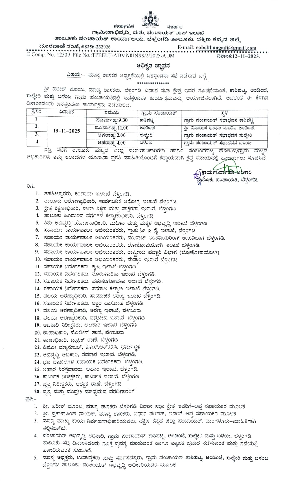 ನ‌.18: ಶಾಸಕ ಹರೀಶ್ ಪೂಂಜರವರ ನೇತೃತ್ವದಲ್ಲಿ ‘ಜನರ ಬಳಿಗೆ- ತಾಲೂಕು ಆಡಳಿತ’ ಪಂಚಾಯತ್ ಮಟ್ಟದ ಜನಸ್ಪಂದನಾ ಕಾರ್ಯಕ್ರಮ