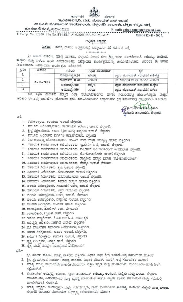 ನ.18: ಶಾಸಕ ಹರೀಶ್ ಪೂಂಜರವರ ನೇತೃತ್ವದಲ್ಲಿ ‘ಜನರ ಬಳಿಗೆ- ತಾಲೂಕು ಆಡಳಿತ’ ಪಂಚಾಯತ್ ಮಟ್ಟದ ಜನಸ್ಪಂದನಾ ಕಾರ್ಯಕ್ರಮ