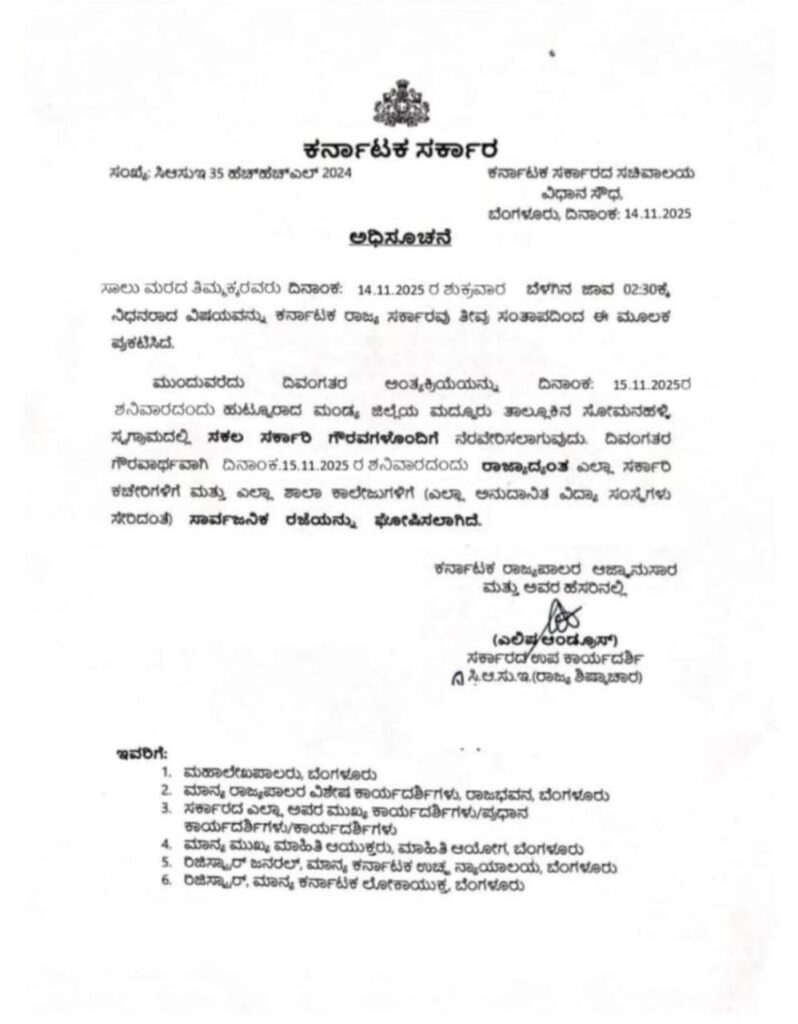 ಬೆಳ್ತಂಗಡಿ: ಉಸಿರಾಟದ ಸಮಸ್ಯೆಯಿಂದ ಬಳಲುತ್ತಿದ್ದ ಪದ್ಮಶ್ರೀ ಪುರಸ್ಕೃತರಾದ ಸಾಲುಮರದ ತಿಮ್ಮಕ್ಕ (114)ಅನಾರೋಗ್ಯದಿಂದ ಚಿಕಿತ್ಸೆ ಫಲಿಸದೆ ನ. 14ರಂದು ವಿಧಿವಶರಾಗಿದ್ದಾರೆ.