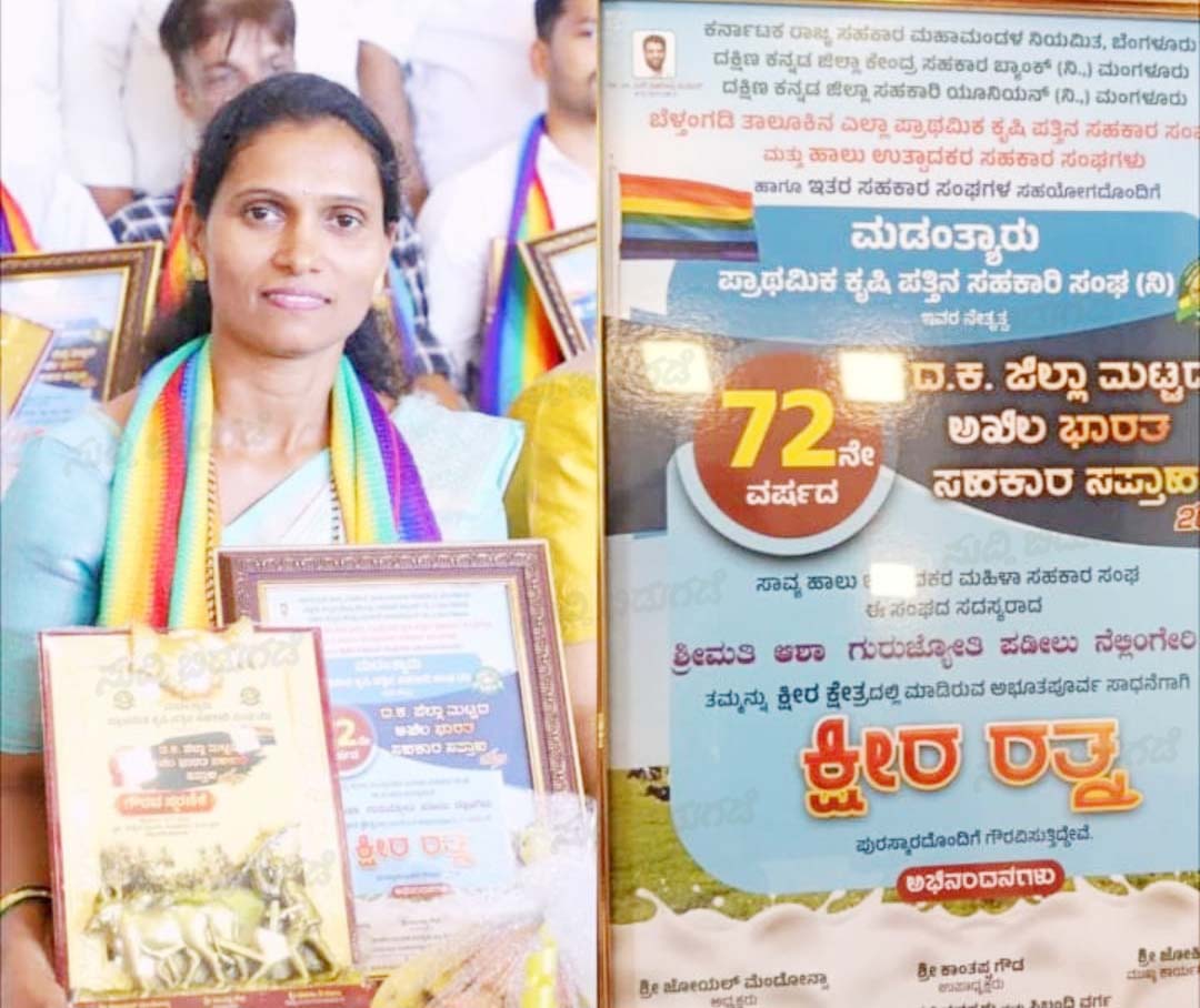 ವೇಣೂರು: ಸಾವ್ಯ ಹಾಲು ಉತ್ಪಾದಕರ ಮಹಿಳಾ ಸಹಕಾರ ಸಂಘ ಇದರ ಅಧ್ಯಕ್ಷೆ, ವೇಣೂರು ಪ್ರಾಥಮಿಕ ಕೃಷಿ ಪತ್ತಿನ ಸಹಕಾರಿ ಸಂಘದ ನಿರ್ದೇಶಕಿ ಆಶಾ ಅವರಿಗೆ ಕ್ಷೀರ ಕ್ಷೇತ್ರದಲ್ಲಿ ಮಾಡಿದ ಅಭೂತಪೂರ್ವ ಸಾಧನೆಯನ್ನು ಗುರುತಿಸಿ ನ. 14 ರಂದು ಮಡಂತ್ಯಾರಿನಲ್ಲಿ ನಡೆದ ಜಿಲ್ಲಾ ಮಟ್ಟದ ಅಖಿಲ ಭಾರತ ಸಹಕಾರಿಸಪ್ತಾಹ ಕಾರ್ಯಕ್ರಮ ದಲ್ಲಿ “ಕ್ಷೀರ ರತ್ನ”ಪ್ರಶಸ್ತಿಯನ್ನು ನೀಡಿ ಗೌರವಿಸಲಾಯಿತು.