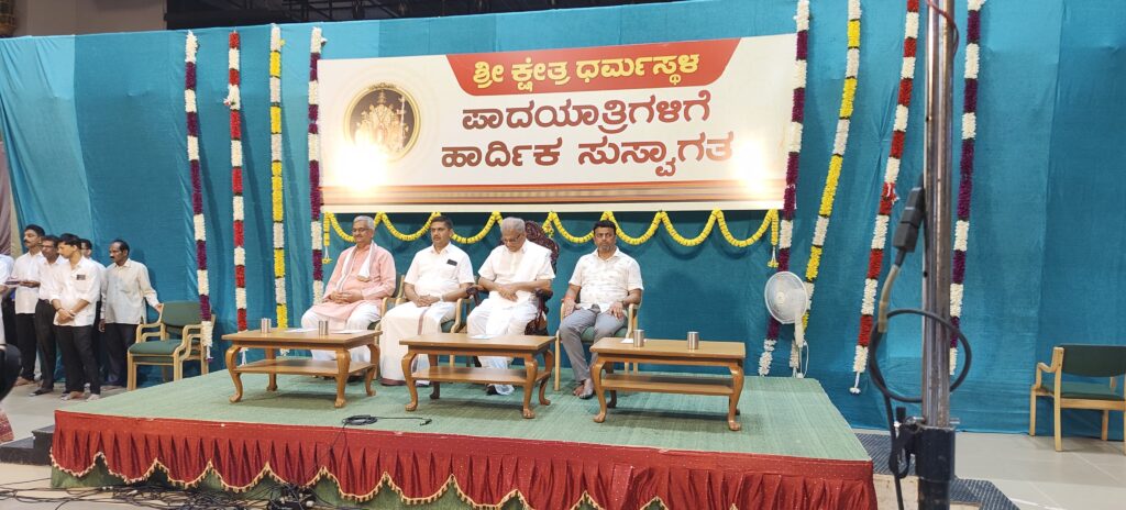 ಪಾದಯಾತ್ರೆ ಮೂಲಕ ಕ್ಷೇತ್ರಕ್ಕೆ ಬಂದ ಭಕ್ತರನ್ನು ಮತ್ತು ಅಭಿಮಾನಿಗಳನ್ನು ದೇವಸ್ಥಾನದ ಮುಖ್ಯ ದ್ವಾರದ ಬಳಿ ಸ್ವಾಗತಿಸಲಾಯಿತು. ಬಳಿಕ ಅಮೃತವರ್ಷಿಣಿ ಸಭಾಂಗಣದಲ್ಲಿ ಪಾದಯಾತ್ರಿಗಳನ್ನು ಉದ್ದೇಶಿಸಿ ಡಾ. ವೀರೇಂದ್ರ ಹೆಗ್ಗಡೆಯವರು ಮಾತನಾಡಿ ಶ್ರೀ ಕ್ಷೇತ್ರ ಧರ್ಮಸ್ಥಳದ ವತಿಯಿಂದ ನರ್ಸಿಂಗ್ ಕಾಲೇಜು ಹಾಗೂ ಕೃಷಿ ಕಾಲೇಜನ್ನು ಈ ವರ್ಷ ಆರಂಭಿಸಲಾಗುವುದು ಎಂದು ಹೇಳಿದರು.