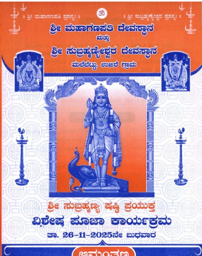 ಉಜಿರೆ: ಮಲೆಬೆಟ್ಟು ಶ್ರೀ ಮಹಾಗಣಪತಿ ದೇವಸ್ಥಾನ ಮತ್ತು ಶ್ರೀ ಸುಬ್ರಹ್ಮಣೇಶ್ವರ ದೇವಸ್ಥಾನದಲ್ಲಿ ನ. 26ರಂದು ಬೆಳಿಗ್ಗೆ ಗಂಟೆ 8-00ರಿಂದ ಮಧ್ಯಾಹ್ನ ಗಂಟೆ 12-00ರ ವರೆಗೆ ಮಲೆಬೆಟ್ಟು ಉದ್ಭವ ಶ್ರೀ ಸುಬ್ರಹ್ಮಣೇಶ್ವರ ಕ್ಷೇತ್ರದಲ್ಲಿ ಶ್ರೀ ಸುಬ್ರಹ್ಮಣ್ಯ ಷಷ್ಠಿ ಪ್ರಯುಕ್ತ ವಿಶೇಷ ಪೂಜಾ ಕಾರ್ಯಕ್ರಮಗಳು ಉಜಿರೆಯ ಯು. ಶರತ್ ಕೃಷ್ಣ ಪಡುವೆಟ್ನಾಯರ ಮಾರ್ಗದರ್ಶನದಲ್ಲಿ ವಿವಿಧ ವೈದಿಕ ಮತ್ತು ಧಾರ್ಮಿಕ ಕಾರ್ಯಕ್ರಮಗಳೊಂದಿಗೆ ನೆರವೇರಲಿರುವುದು.