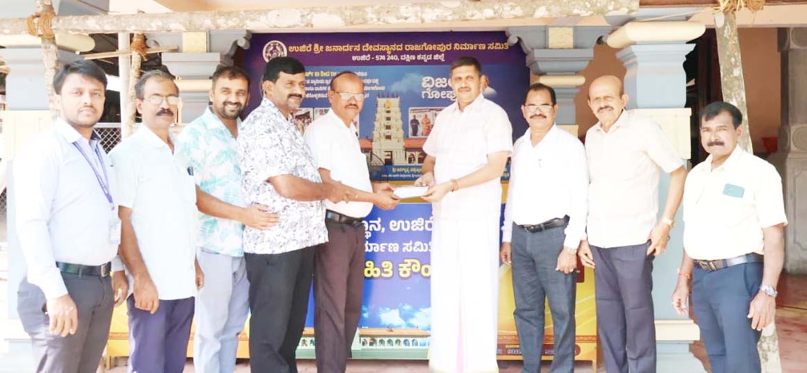 ಉಜಿರೆ: ಶ್ರೀ ಜನಾರ್ಧನ ಸ್ವಾಮಿ ದೇವಸ್ಥಾನದ ರಾಜಗೋಪುರ ವಿಜಯ ಗೋಪುರದ ನಿರ್ಮಾಣ ಕಾರ್ಯವು ಬರದಿಂದ ಸಾಗುತ್ತಿದೆ. ಈ ಪುಣ್ಯ ಕಾರ್ಯಕ್ಕೆ ಅನುಗ್ರಹ ವಿವಿಧೋದ್ದೇಶ ಸಹಕಾರ ಸಂಘದಿಂದ ದೇಣಿಗೆಯಾಗಿ ರೂ. 50,000/- ಗಳ ಚೆಕ್ಕನ್ನು ಸಂಘದ ಅಧ್ಯಕ್ಷ ವಲೇರಿಯನ್ ರೊಡ್ರಿಗಸ್ ಅವರು ದೇವಸ್ಥಾನದ ಅನುವಂಶಿಕ ಆಡಳಿತ ಮೊಕ್ತೇಸರ ಶರತ್ ಕೃಷ್ಣ ಪಡುವೆಟ್ನಾಯ ಅವರಿಗೆ ಹಸ್ತಾಂತರಿಸಿದರು.