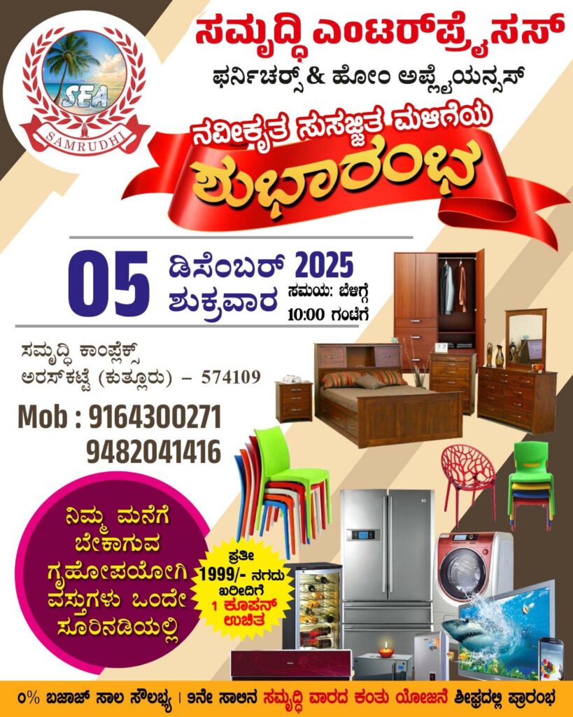 ಬೆಳ್ತಂಗಡಿ: ಸಮೃದ್ಧಿ ಎಂಟರ್ ಪ್ರೈಸಸ್ ಫರ್ನಿಚರ್ಸ್ & ಹೋಂ ಅಪ್ಲೈಯನ್ಸಸ್ ನವೀಕೃತ ಸುಸಜ್ಜಿತ ಮಳಿಗೆಯ ಶುಭಾರಂಭ ಡಿ.5ರಂದು ಬೆಳಿಗ್ಗೆ 10 ಗಂಟೆಗೆ ಕುತ್ಲೂರು ಅರಸ್ ಕಟ್ಟೆ ಸಮೃದ್ಧಿ ಕಾಂಪ್ಲೆಕ್ಸ್ ನಲ್ಲಿ ಶುಭಾರಂಭಗೊಳ್ಳಲಿದೆ.