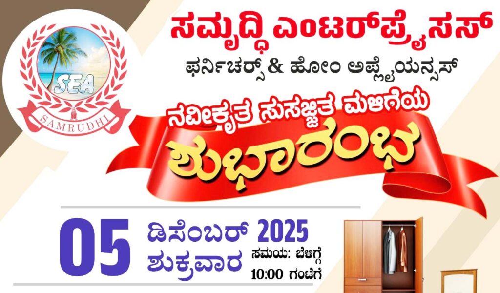 ಬೆಳ್ತಂಗಡಿ: ಸಮೃದ್ಧಿ ಎಂಟರ್ ಪ್ರೈಸಸ್ ಫರ್ನಿಚರ್ಸ್ & ಹೋಂ ಅಪ್ಲೈಯನ್ಸಸ್ ನವೀಕೃತ ಸುಸಜ್ಜಿತ ಮಳಿಗೆಯ ಶುಭಾರಂಭ ಡಿ.5ರಂದು ಬೆಳಿಗ್ಗೆ 10 ಗಂಟೆಗೆ ಕುತ್ಲೂರು ಅರಸ್ ಕಟ್ಟೆ ಸಮೃದ್ಧಿ ಕಾಂಪ್ಲೆಕ್ಸ್ ನಲ್ಲಿ ಶುಭಾರಂಭಗೊಳ್ಳಲಿದೆ.