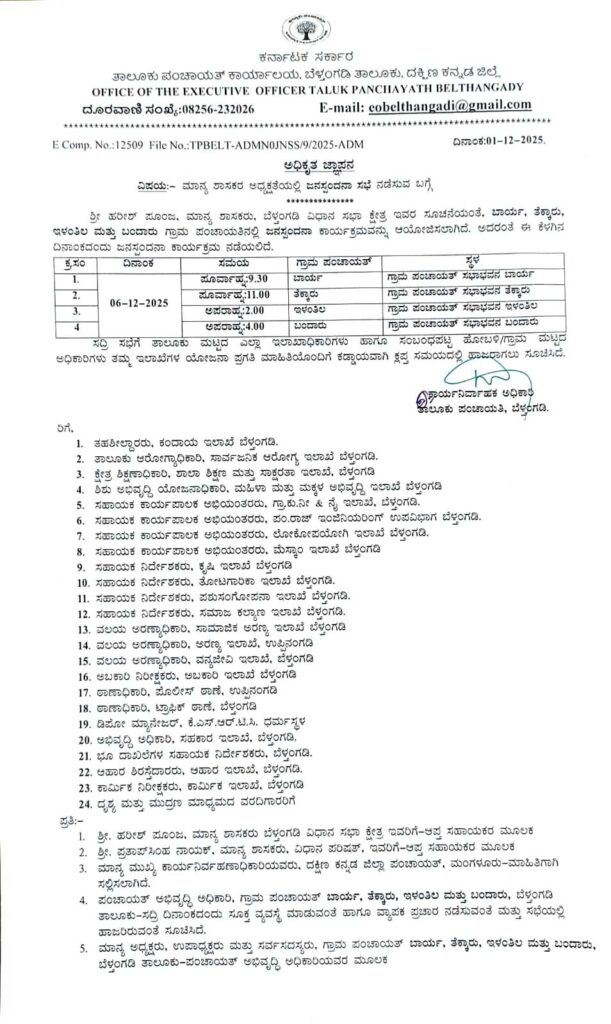 ಡಿ.6: ಶಾಸಕ ಹರೀಶ್ ಪೂಂಜರವರ ನೇತೃತ್ವದಲ್ಲಿ ‘ಜನರ ಬಳಿಗೆ- ತಾಲೂಕು ಆಡಳಿತ’ ಪಂಚಾಯತ್ ಮಟ್ಟದ ಜನಸ್ಪಂದನ ಕಾರ್ಯಕ್ರಮ