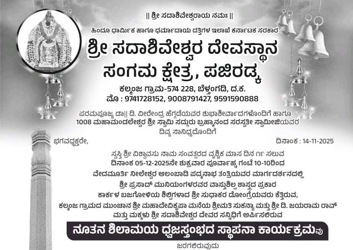 ಕಲ್ಮಂಜ: ಶ್ರೀ ಸದಾಶಿವೇಶ್ವರ ದೇವಸ್ಥಾನ ಸಂಗಮ ಕ್ಷೇತ್ರಕ್ಕೆ ಮುಂಚಾನ ಶ್ರೀ ಮಹಾದೇವಿಕೃಪಾ ಮನೆಯ ಶ್ರೀಮತಿ ಸುಕನ್ಯಾ ಮತ್ತು ಜಯರಾಮ ರಾವ್ ಮತ್ತು ಮಕ್ಕಳು ಸಮರ್ಪಿಸಲಿರುವ ನೂತನ ಶಿಲಾಮಯ ಧ್ವಜಸ್ಥಂಭವು ಕಾರ್ಕಳದಿಂದ ಹೊರಟು ಬೆಳ್ತಂಗಡಿ ಮಾರ್ಗವಾಗಿ ಡಿ.04 ರಂದು ಉಜಿರೆಗೆ ತಲುಪಲಿದೆ.