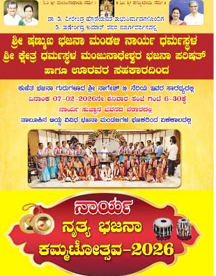 ಧರ್ಮಸ್ಥಳ: ಶ್ರೀ ಷಣ್ಮುಖ ಭಜನಾ ಮಂಡಳಿ ನಾರ್ಯ ಹಾಗೂ ಶ್ರೀ ಕ್ಷೇತ್ರ ಧರ್ಮಸ್ಥಳ ಮಂಜುನಾಥೇಶ್ವರ ಭಜನಾ ಪರಿಷತ್ ಹಾಗೂ ಊರವರ ಸಹಕಾರದಿಂದ ಫೆ. 7ರಂದು ಸುಜ್ಞಾನ ಭವನ ನಾರ್ಯ ಅಂಗನವಾಡಿ ವಠಾರದಲ್ಲಿ ನಡೆಯುವ ತಾಲೂಕಿನ ಆಯ್ದ ವಿವಿಧ ಭಜನಾ ಮಂಡಳಿಗಳ ಭಜಕರರಿಂದ ಏಕಕಾಲದಲ್ಲಿ ನೃತ್ಯ ಭಜನಾ ಕಮ್ಮಟೋತ್ಸವ -2026 ಇದರ ಆಮಂತ್ರಣವನ್ನು ಡಾ. ಡಿ ವೀರೇಂದ್ರ ಹೆಗ್ಗಡೆಯವರು ಡಿ. 9ರಂದು ಬಿಡುಗಡೆಗೊಳಿಸಿ ಶುಭ ಹಾರೈಸಿದರು.